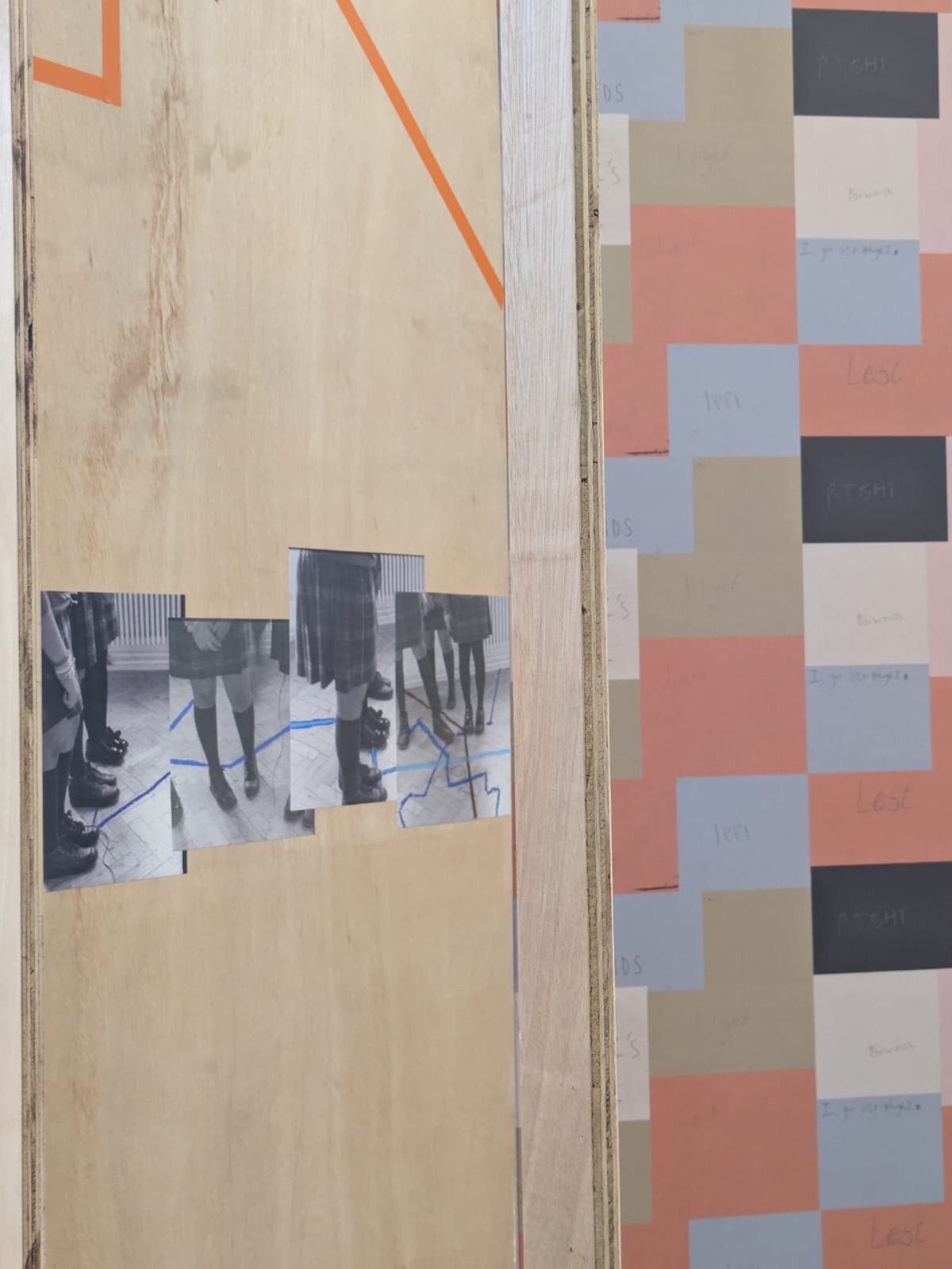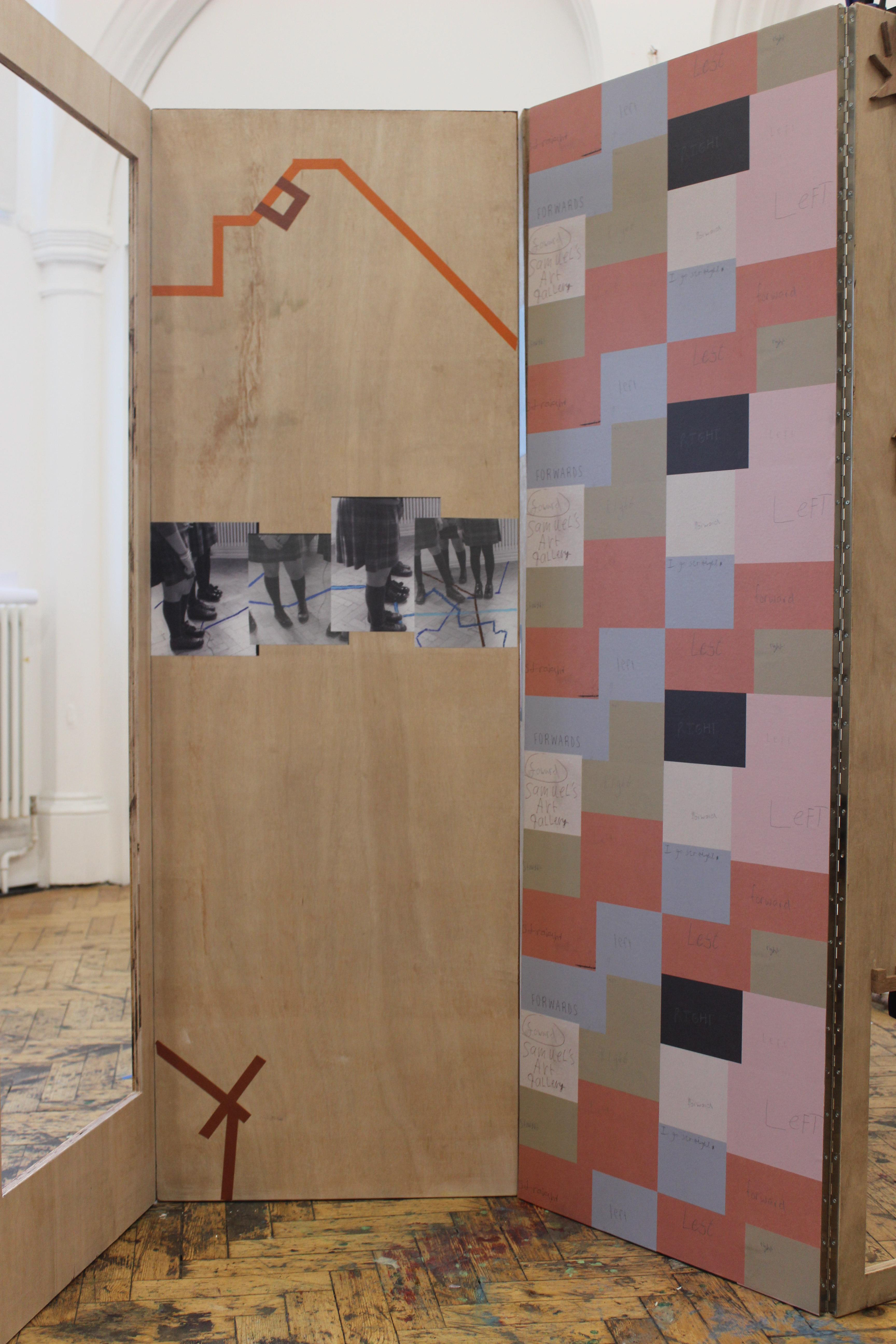 In the programmes final presentation on a 6-paneled 2 metre by 0.5 metre Marine Ply structure, the piece is punctuated by sections of tape reflective of routes created by students, a full panel of 'classroom route packs' which read - left, right, straight, and backward. As well as photographic fragments of the students restaging their route journeys and wooden cutouts of forms encountered on these. Cutouts within the stand invite the viewer to step through, and bend down when viewing images at different intervals.
