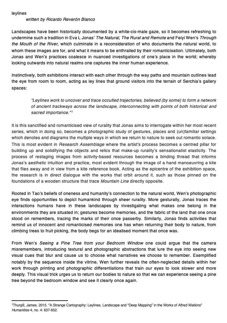 on the occasion of 'The Natural, Rural and Remote' showing alongside Feiyi Wen's 'Through the Mouth of the River' at Serchia Gallery, Bristol.