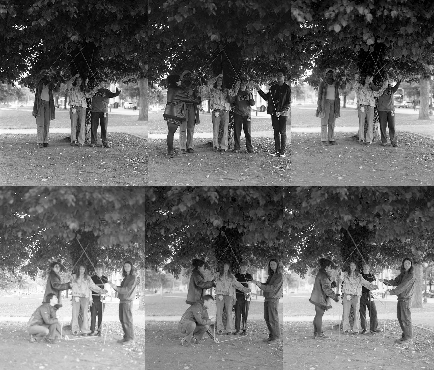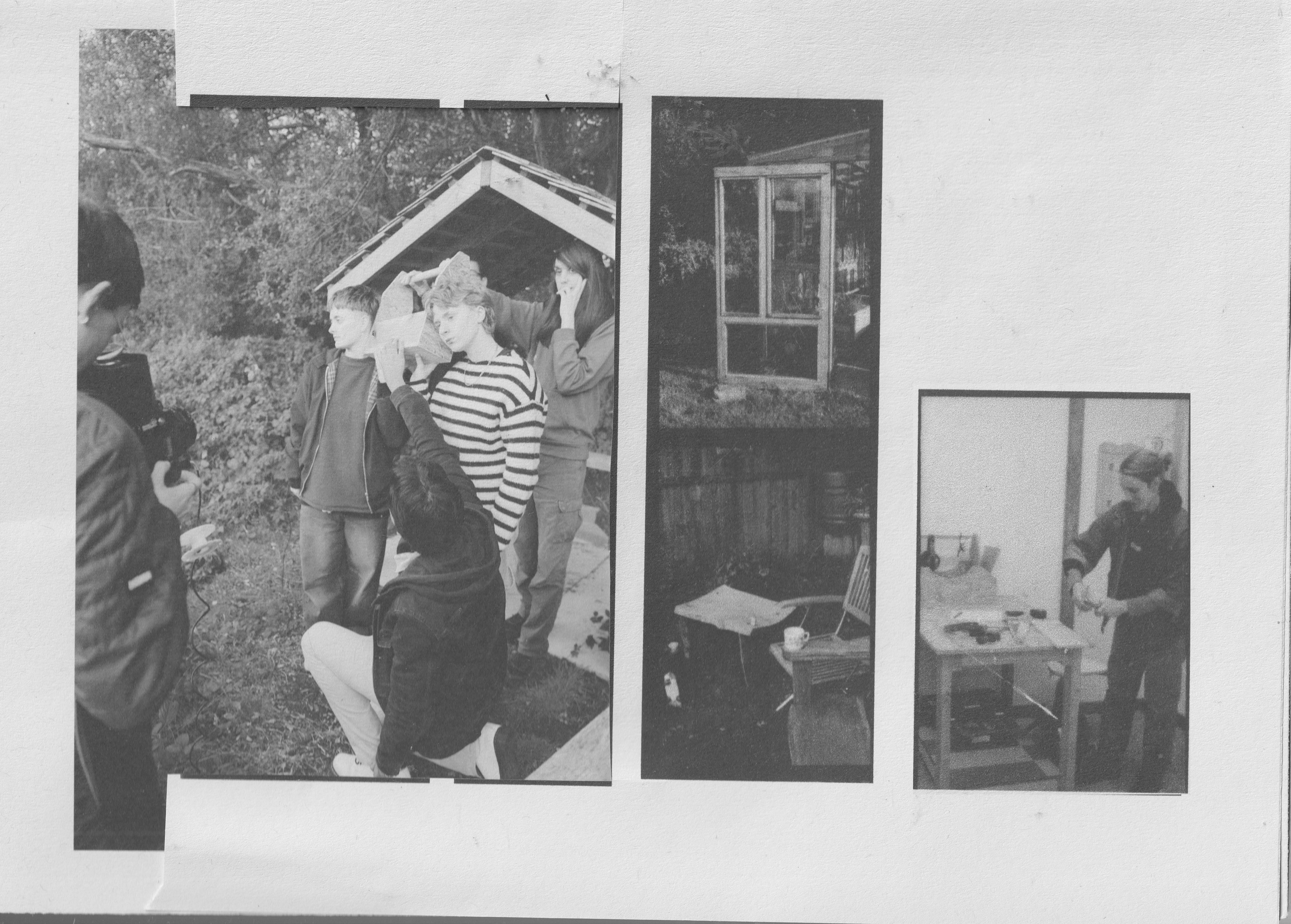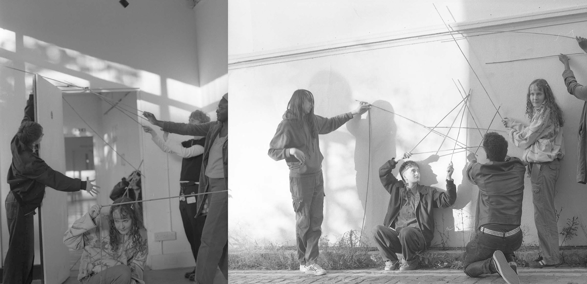 Across three months, the group’s shared enquiry moved between photography, sculpture, and research. Early sessions centred performance as a mode of thinking, staging the prompt to build a shelter together using wooden sticks and a cable release, allowing images to be produced collectively. These photographs were subsequently reworked and re-situated, placed as objects on sculptural models of houses and shelters, and installed as layered wall works that reveal fragments and visual associations beneath them.